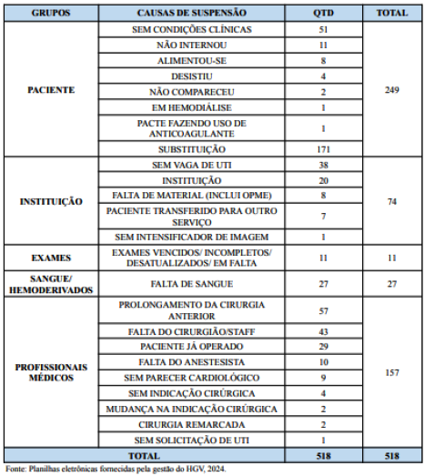 Entre janeiro e abril de 2024, foram registradas 518 cirurgias suspensas no bloco cirúrgico, classificadas em cinco grandes grupos de causas, como pode ser visto na tabela abaixo: